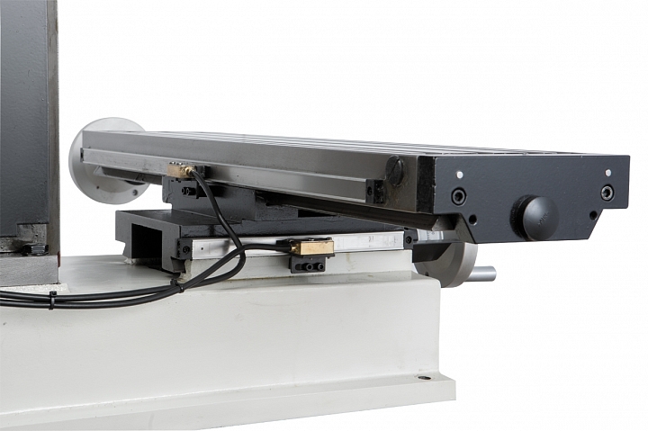 Крестовый рабочий стол имеет длину 700 мм, двигается по направляющим типа ласточкин хвост. Станок оснащен опцией автоматической подачи стола по оси X, имеет 3 Т-образных паза шириною 12 мм для установки дополнительного крепежа.