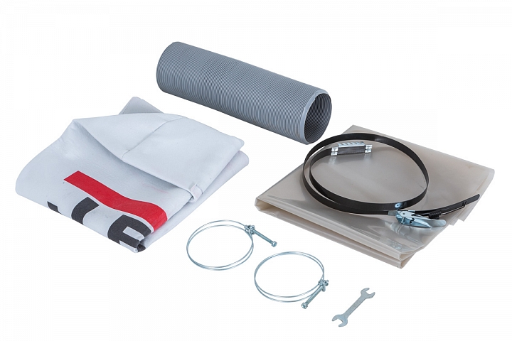 Установка подходит для эксплуатации с деревообрабатывающими станками любых типов и позволяет собирать как крупный мусор вроде стружки, так и мелкий (опилки, пыль от шлифования). В зависимости от плотности отходов они либо оседают в пластиковый мешок-накопитель, либо задерживаются фильтром из плотной ткани. Для очистки фильтр стряхивают, не снимая, а пластиковый мешок выносят; поскольку он крепится хомутом с застежкой, монтаж/демонтаж занимают считанные секунды.
